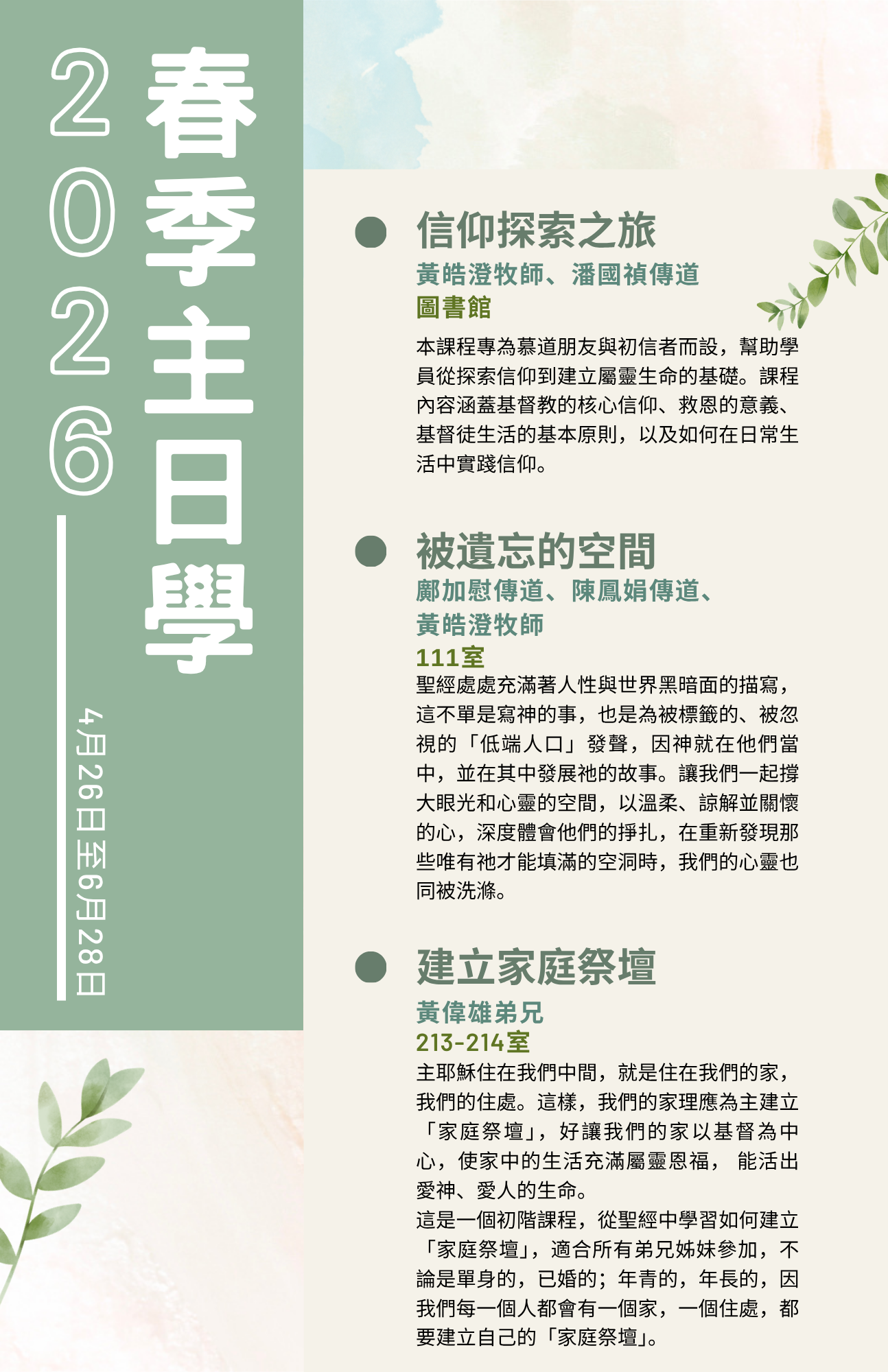 2026春季主日學將於 4 月 26 日至 6 月 28 日舉行共三課:「信仰探索之旅」、 「被遺忘的空間」及「建立家庭祭壇」,鼓勵弟兄姊妹參與主日學,一同扎根於主裏。
